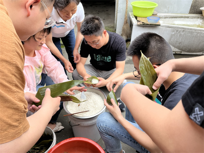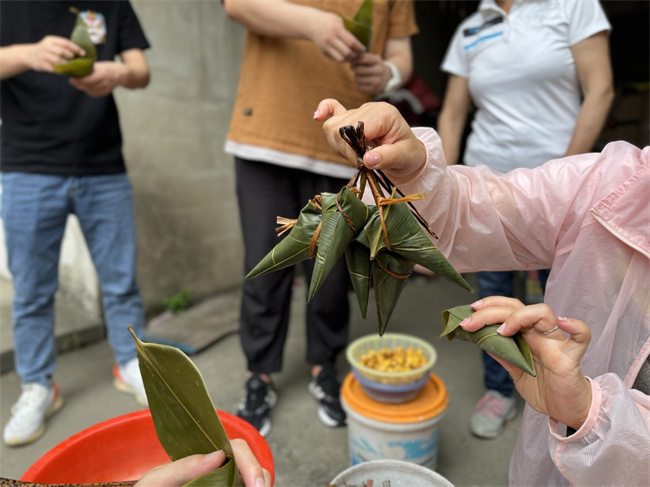 大家互相分享著包粽子的經(jīng)驗(yàn),將滿載美好寓意的蓮子、蜜棗、紅豆、綠豆、花生、用清香箬葉包裹,歡聲笑語中,一片片粽葉、一粒粒糯米,在靈巧的手中變成了香甜可口的粽子。