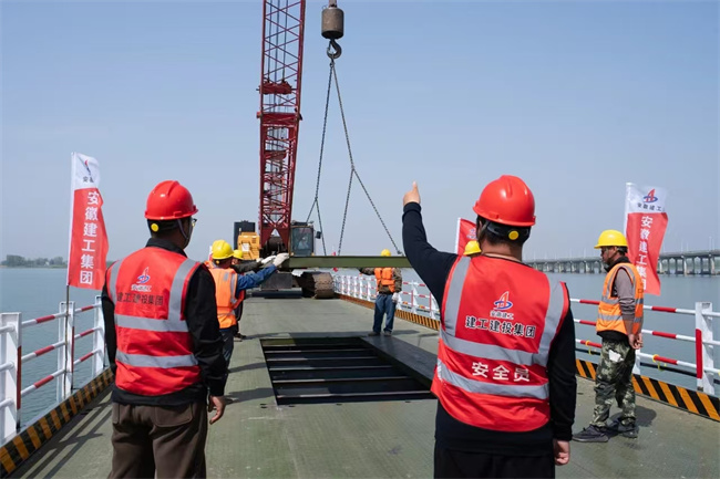 城西湖特大橋全長9117m,位于霍邱縣既有G328國道上游300m處,跨越2.5公里寬城西湖水面,整個(gè)特大橋共計(jì)75聯(lián),引橋采用跨徑組合為30m和40m先簡支后連續(xù)預(yù)應(yīng)力混凝土小箱梁,主橋采用50m+80m+50m變截面鋼箱梁。此次貫通的鋼便橋全長約2.4公里,寬6米。