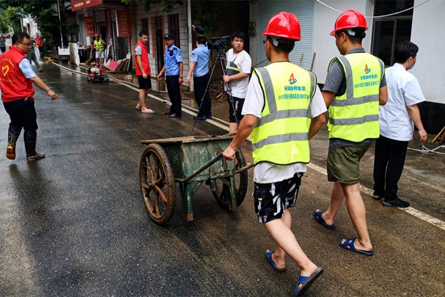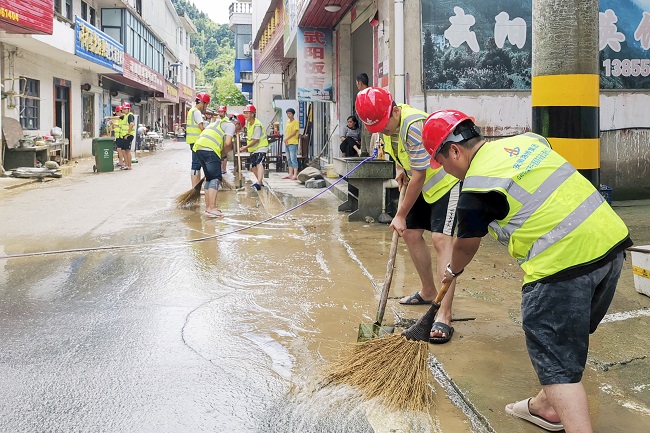 7月9日,洪水退后,當地政府組織災后自救工作。項目部再一次集體出動,深入受災現場,積極主動參與武陽村及武陽鄉街道災后恢復工作。