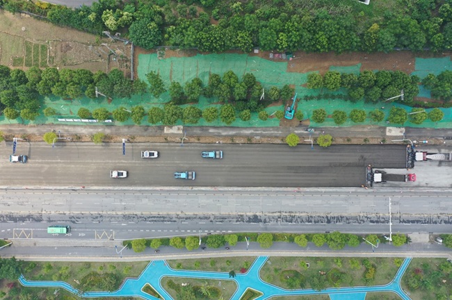 本次施工采用7臺搭載北斗高精度定位系統的智能設備進行協同作業,通過預設參數實現攤鋪碾壓軌跡自動規劃,規避了傳統工藝中欠壓、漏壓等質量隱患,實現了攤鋪和碾壓的精準控制,具有降低施工成本、提高施工效率的優勢。