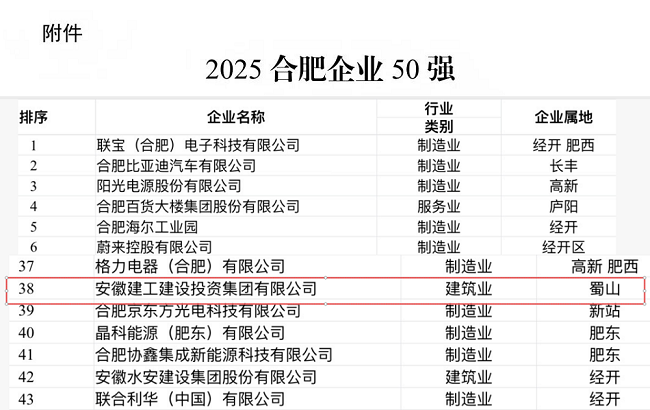 10月28日,合肥市企業(yè)(企業(yè)家)聯(lián)合會(huì)正式發(fā)布2025合肥企業(yè)50強(qiáng)榜單。憑借出色的綜合實(shí)力,建工建投集團(tuán)連續(xù)四年入選!