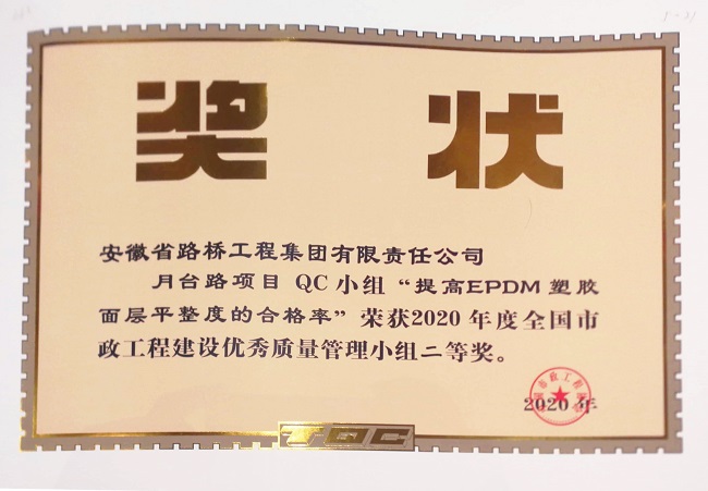 選送的3項QC成果中,公司新基建QC小組“提高白加黑道路板塊處理一次檢測合格率”和火炎焱燚QC小組“提高瀝青路面平整度的合格率”兩項作品榮獲2020年全國市政工程建設優秀質量管理小組一等獎,月臺路QC小組“提高EPDM塑膠面層平整度的合格率”榮獲二等獎。