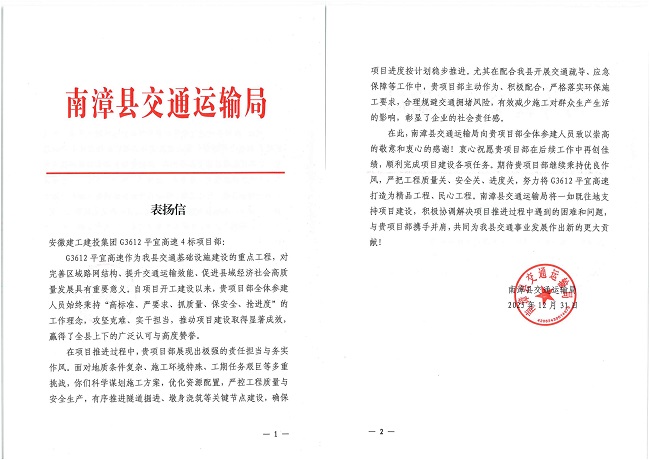 近日,建工建投集團G3612平宜高速4標項目收到了南漳縣交通運輸局、襄陽至宜昌高速公路南漳段建設工程協調指揮部發來的表揚信。