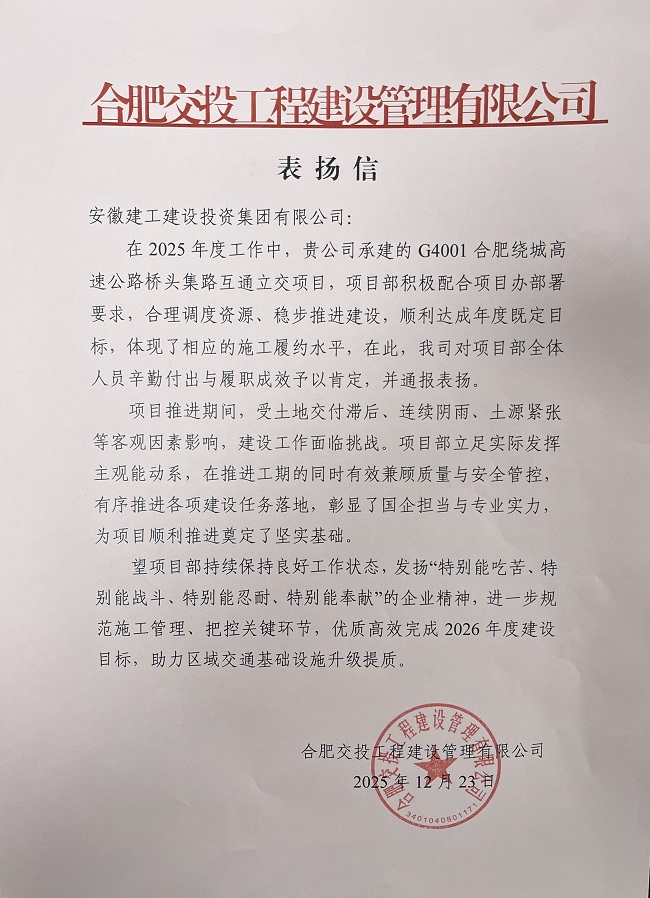 近日,合肥交投工程建設管理有限公司向建工建投集團發(fā)來表揚信,對建工建投集團G4001合肥繞城高速公路橋頭集路互通立交項目2025年度工作成效給予高度肯定,對項目部全體人員的辛勤付出和履職表現(xiàn)提出通報表揚。