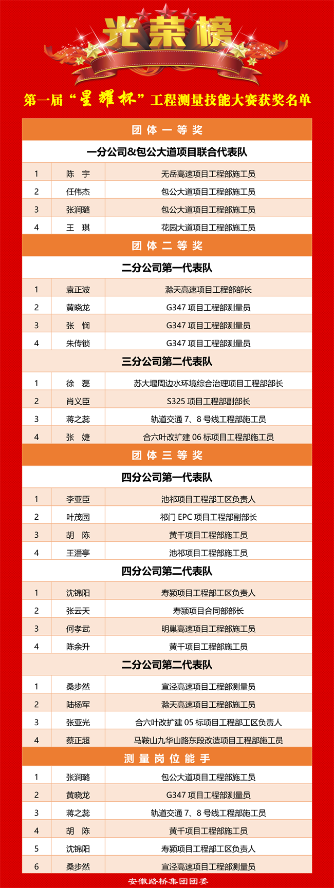 最終,經(jīng)過近5小時(shí)、5輪次的角逐,一分公司&包公大道項(xiàng)目聯(lián)合隊(duì)斬獲團(tuán)隊(duì)一等獎(jiǎng);二分公司一隊(duì)、三分公司二隊(duì)榮獲團(tuán)體二等獎(jiǎng);二分公司二隊(duì)、四分公司一隊(duì)、四分公司二隊(duì)榮獲團(tuán)體三等獎(jiǎng);張澗璐、黃曉龍、蔣之蕊、胡陳、沈錦陽、桑步然等6人榮獲“測(cè)量崗位能手”稱號(hào)。