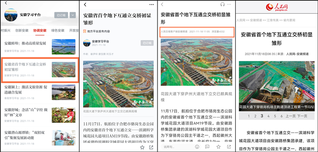 11月18日,安徽惟一重點(diǎn)新聞門戶網(wǎng)站——中安在線于首頁頭版位置以《安徽省首個地下互通立交橋初顯雛形》為題,以圖文形式,聚焦安徽路橋集團(tuán)濱湖科學(xué)城花園大道項目施工進(jìn)展情況,對項目創(chuàng)下全省市政道路建設(shè)史上的多項第一予以重點(diǎn)報道。稿件隨后被學(xué)習(xí)強(qiáng)國、人民日報客戶端、人民網(wǎng)、央廣網(wǎng)、北青網(wǎng)、騰訊網(wǎng)、新浪網(wǎng)等多家主流媒體轉(zhuǎn)載發(fā)布,路橋集團(tuán)建設(shè)者攻堅克難,斗志昂揚(yáng)的良好精神風(fēng)貌被予以細(xì)致描繪,公司良好企業(yè)形象得到進(jìn)一步彰顯。