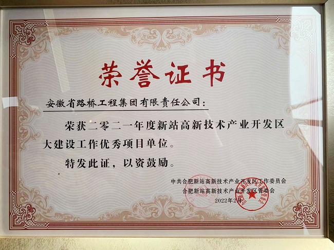 近日,合肥市新站高新區召開22年大建設工作會議,安徽路橋集團獲評“2021年度大建設工作優秀項目單位”。