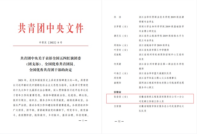 2022年是中國(guó)共青團(tuán)成立100周年。近日,共青團(tuán)中央作出表彰決定,安徽路橋集團(tuán)一分公司黨群工作部張瑩瑩榮獲“全國(guó)優(yōu)秀共青團(tuán)員”稱(chēng)號(hào),該稱(chēng)號(hào)是共青團(tuán)中央授予團(tuán)員青年的最高榮譽(yù)!