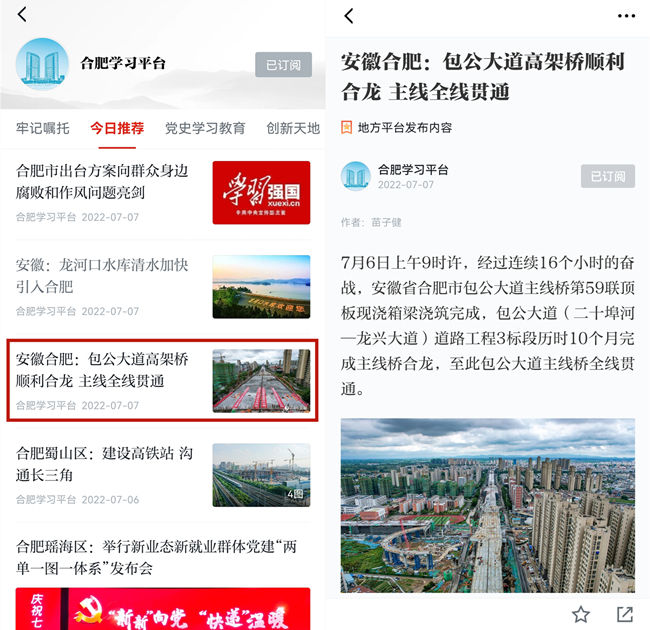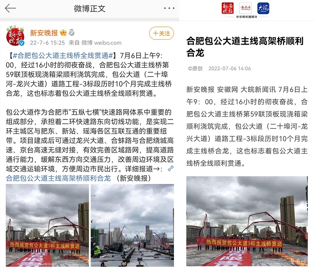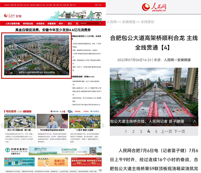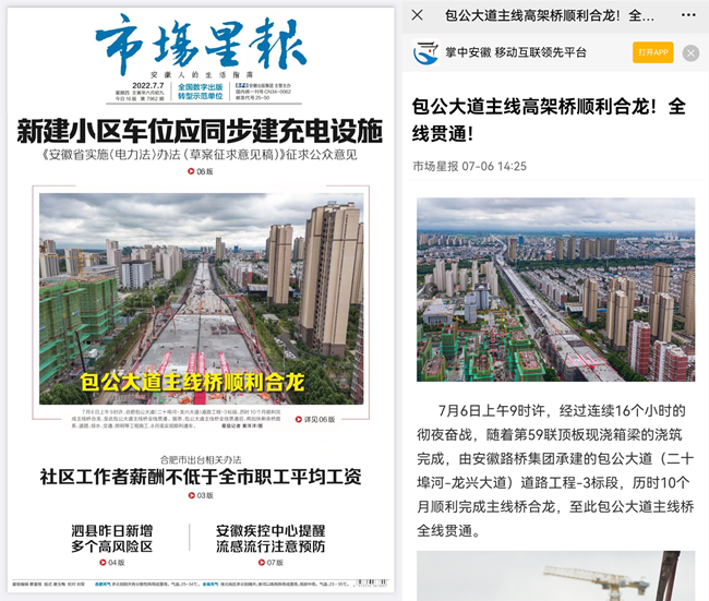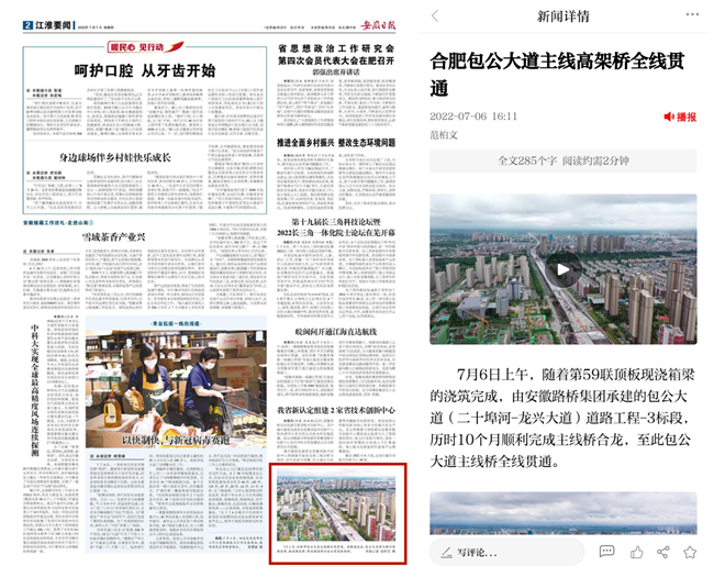 隨后,學習強國、人民網、央廣網、《安徽日報》、中安在線、《市場星報》、《合肥晚報》、《新安晚報》、安徽網等一批主流媒體重點報道路橋集團建設成果,網易、新浪、騰訊等平臺對稿件積極轉載。