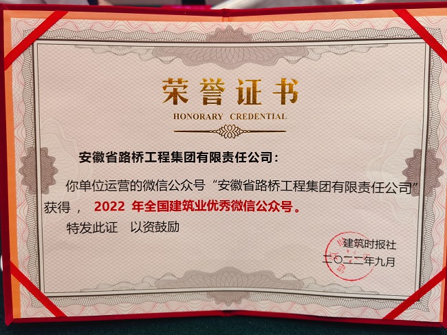 9月25日,2022年建筑業微信公眾號運維經驗交流研討會暨全國建筑業優秀公眾號頒獎典禮在湖北省武漢市召開。連續三年,公司微信公眾號“安徽省路橋工程集團有限責任公司”(微信號:ahlqjt)再獲“全國建筑業優秀微信公眾號”榮譽稱號。