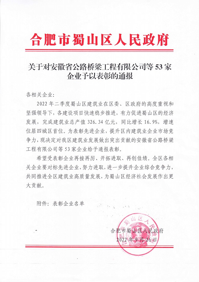 9月26日,合肥市蜀山區人民政府發來表彰通報,對公司二季度所屬各項目快速穩步推進工程建設,有力促進區域經濟發展,提升區內建筑業企業市場競爭力所做出的突出貢獻給予高度贊揚。