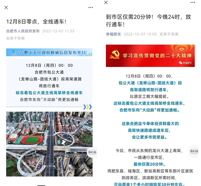“合肥市人民政府發布”、“幸福肥東”、《合肥日報》、《安徽商報》等官方政務微信號、官方微信號對路橋集團建設成果予以報道展現。